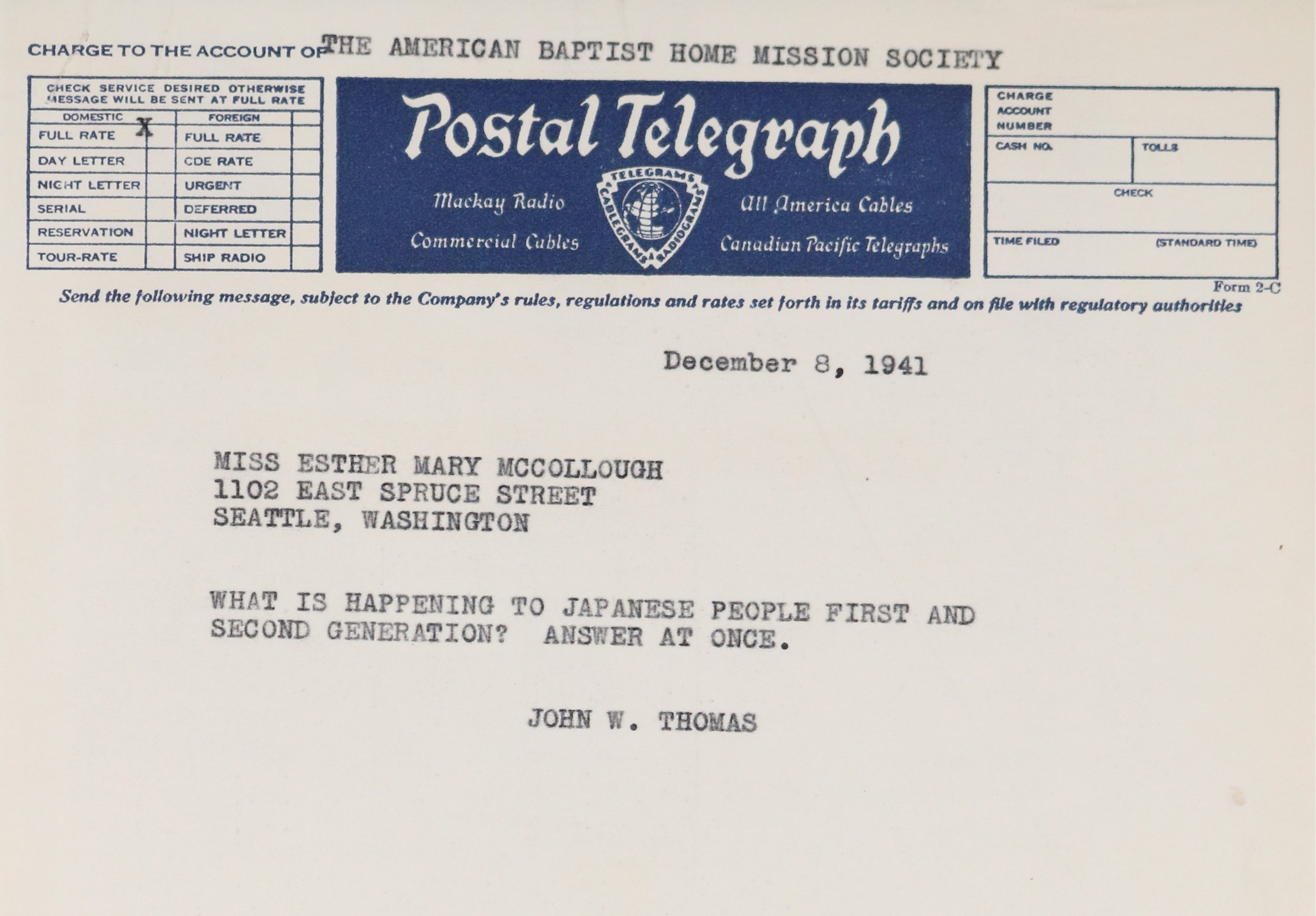 Telegram of John Thomas to Esther McCullough, requesting information about the status of Japanese-Americans following the bombing of Pearl Harbor.
