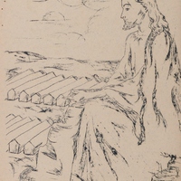 Illustration depicting Jesus praying above rows of barracks. From Meditation Moments, a collection of devotions and testimonials written and published by members of the Federated Christian Church at Poston War Relocation Center.