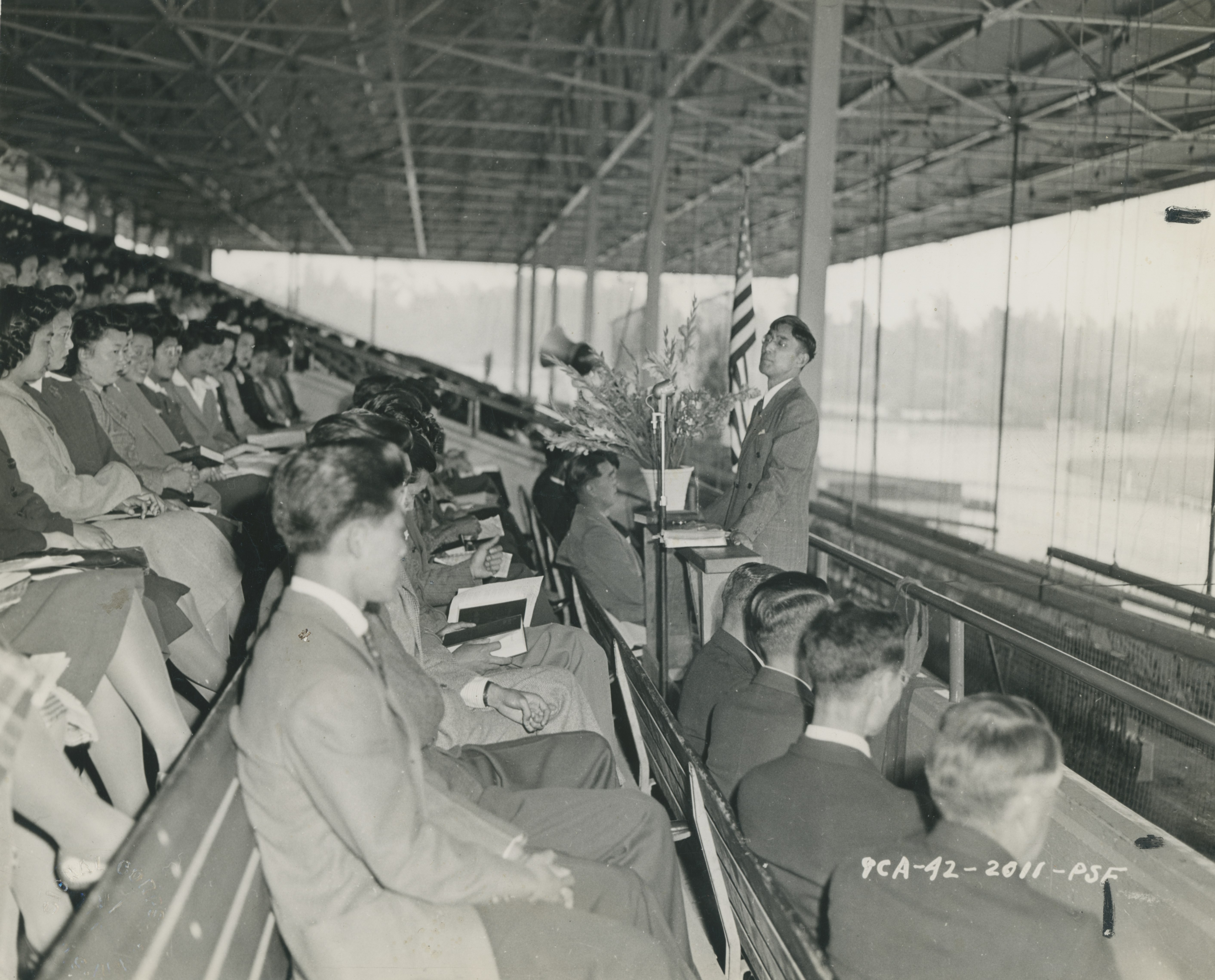 Photograph of a service of the Federated Protestant Church, held in the racetrack stands at Santa Anita Assembly Center.
